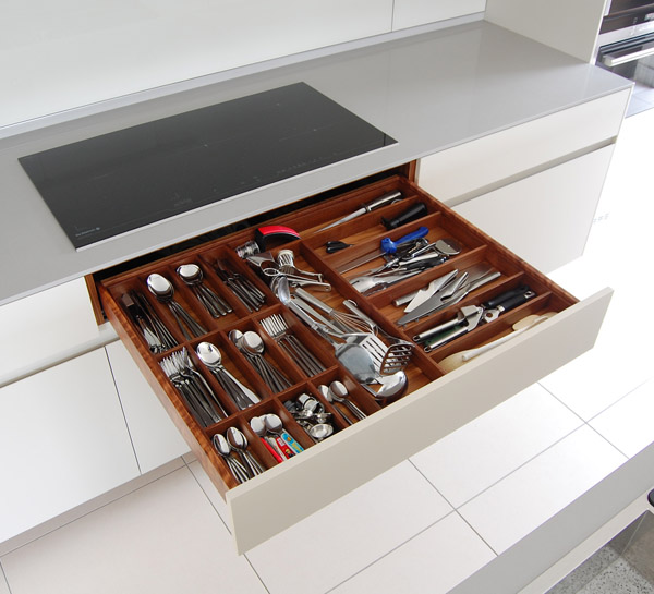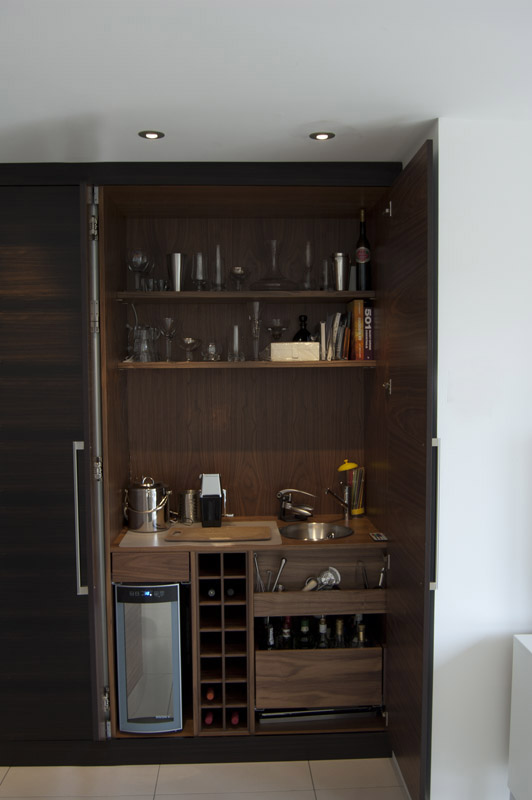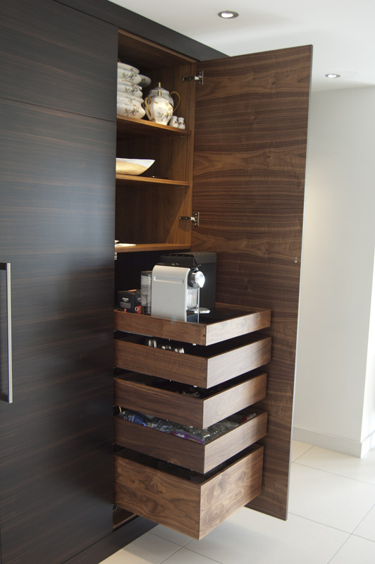 Hand veneered Macassor Ebony doors and extractor housing set the tone of this stunning kitchen. Doors and drawer fronts spray painted to the clients colour, conceal clear lacquered American Black Walnut carcases. Large Solid Walnut pan drawers, with additional drawers for the lids and baking trays add to the design of this kitchen.